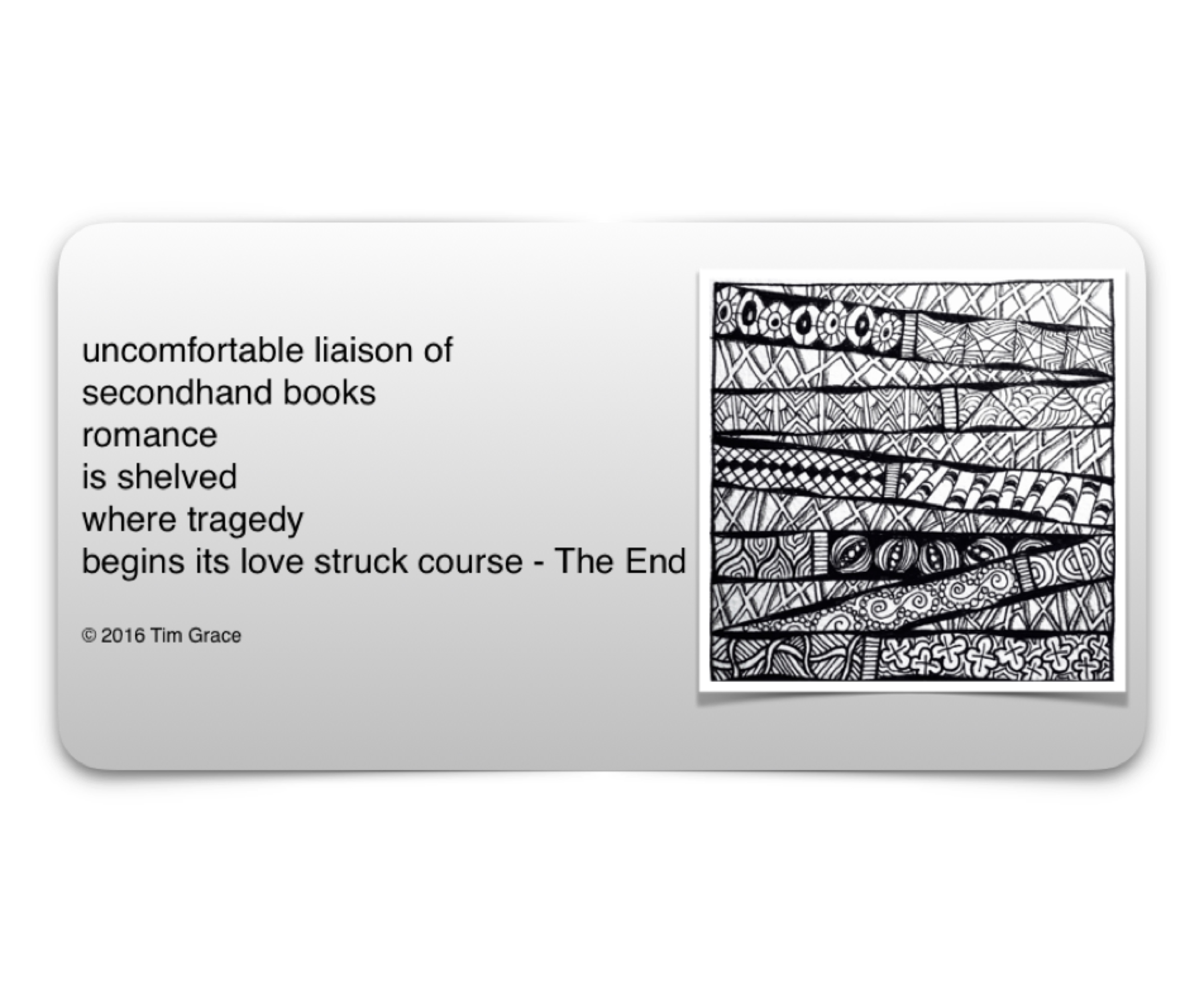 Love struck course May 1, 2017August 1, 2022 by sonneteer155, posted in Bookshop, Design, Drawing, Emotions, English Poetry, Love, Place, Reading, Tragedy, Zentangles Share this: Click to share on X (Opens in new window) X Click to share on Facebook (Opens in new window) Facebook Click to share on Pinterest (Opens in new window) Pinterest Like Loading...